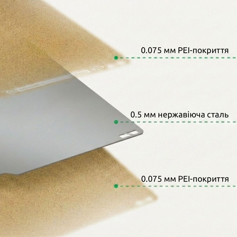 - Магнітна фіксація та стійкість до деформацій. Пластина з нержавіючої сталі завтовшки 0.5 мм забезпечує магнітну адгезію, що запобігає викривленню першого шару навіть при роботі з примхливими матеріалами (ABS, PC, Nylon) та великими 3D-моделями.