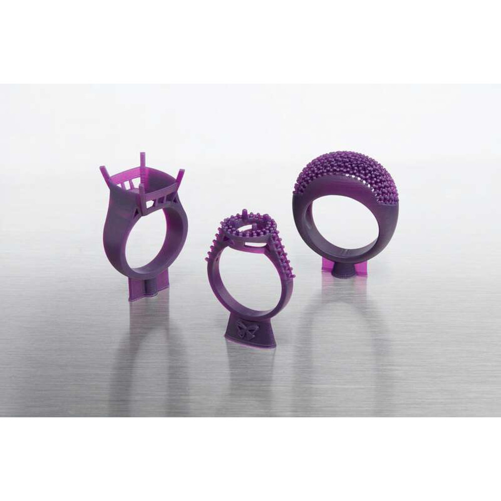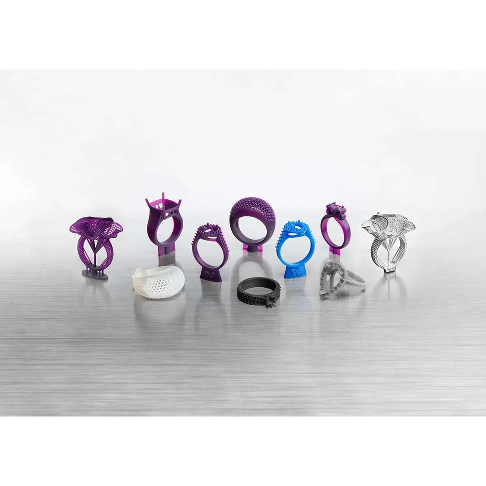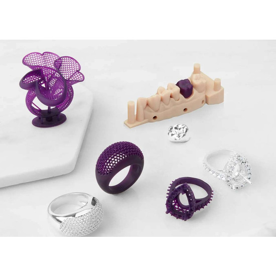 Дизайнери ювелірних виробів можуть розширити межі геометрії з Formlabs Castable Wax Resin. Висока початкова міцність ("green strength") та жорсткість дозволяють друкувати надтонкі структури, такі як делікатна дротяна філігрань та оправи паве, без деформації. Матеріал достатньо міцний для індивідуальних примірок та створення прототипів, але при цьому чисто вигорає для прямого лиття каблучок, кулонів та складних виробів на замовлення.